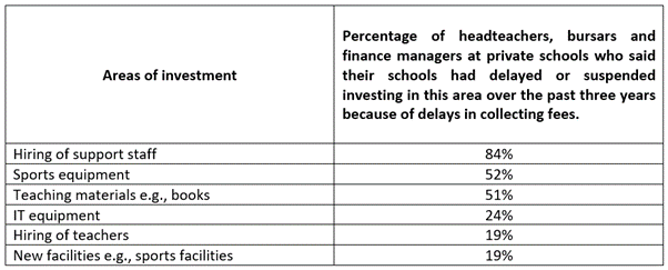 In terms of which areas their schools cancelled or suspended investing in because of late fees payment, 84% cited the hiring of support staff, and this was followed by 52% who said sports equipment, and 51% who said teaching materials, such as books.